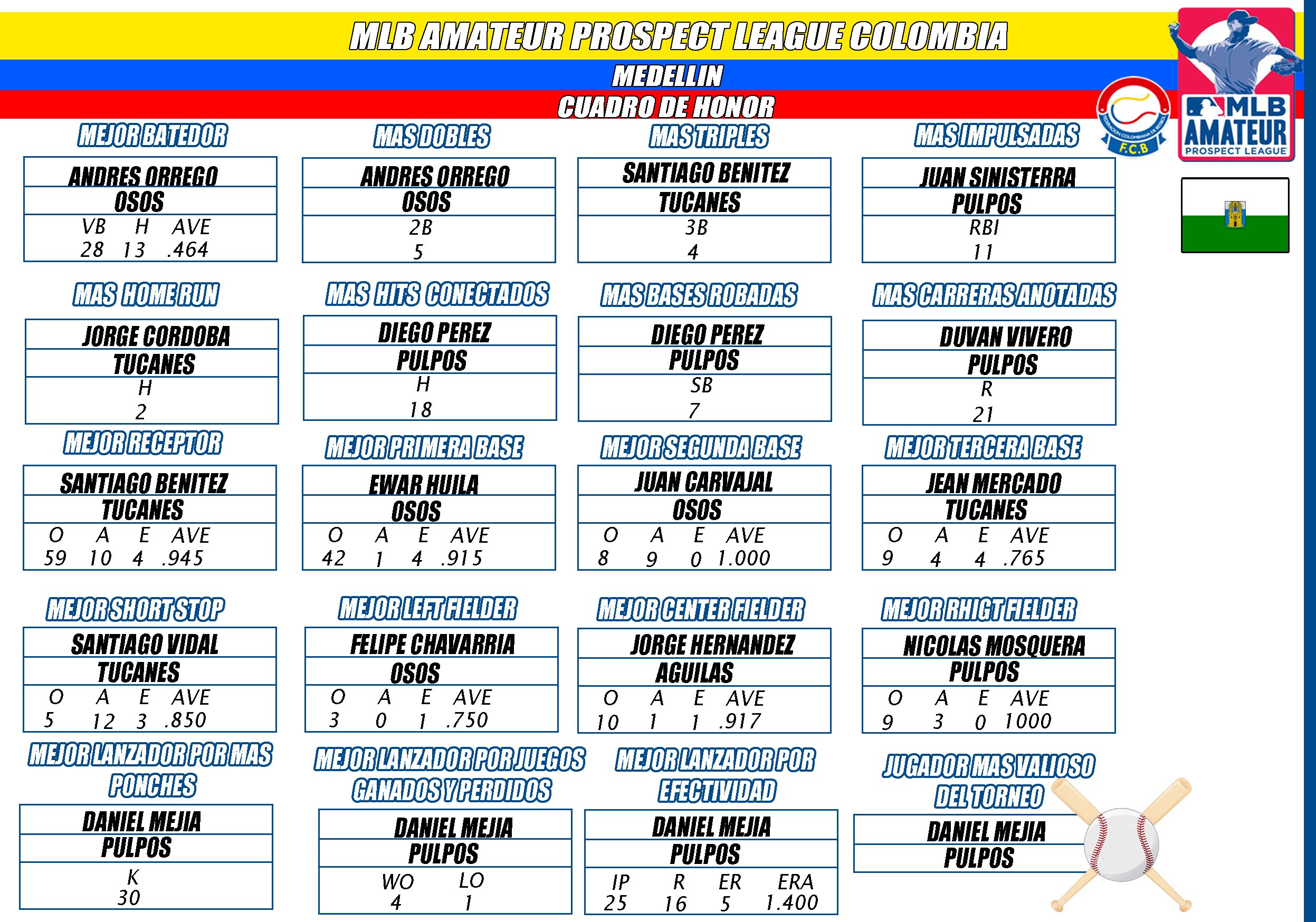 Diego Arias lanzó con propiedad durante 4.0 entradas, la ofensiva se dio banquete conectando 13 imparables y Bolívar se convirtió en el primer campeón del Torneo MLBAmateur Prospect League Colombia al derrotar por la vía del “nocaut” 11 carreras por 1 a Bogotá, en el Diamante “Luís Alberto Villegas” de Medellín.