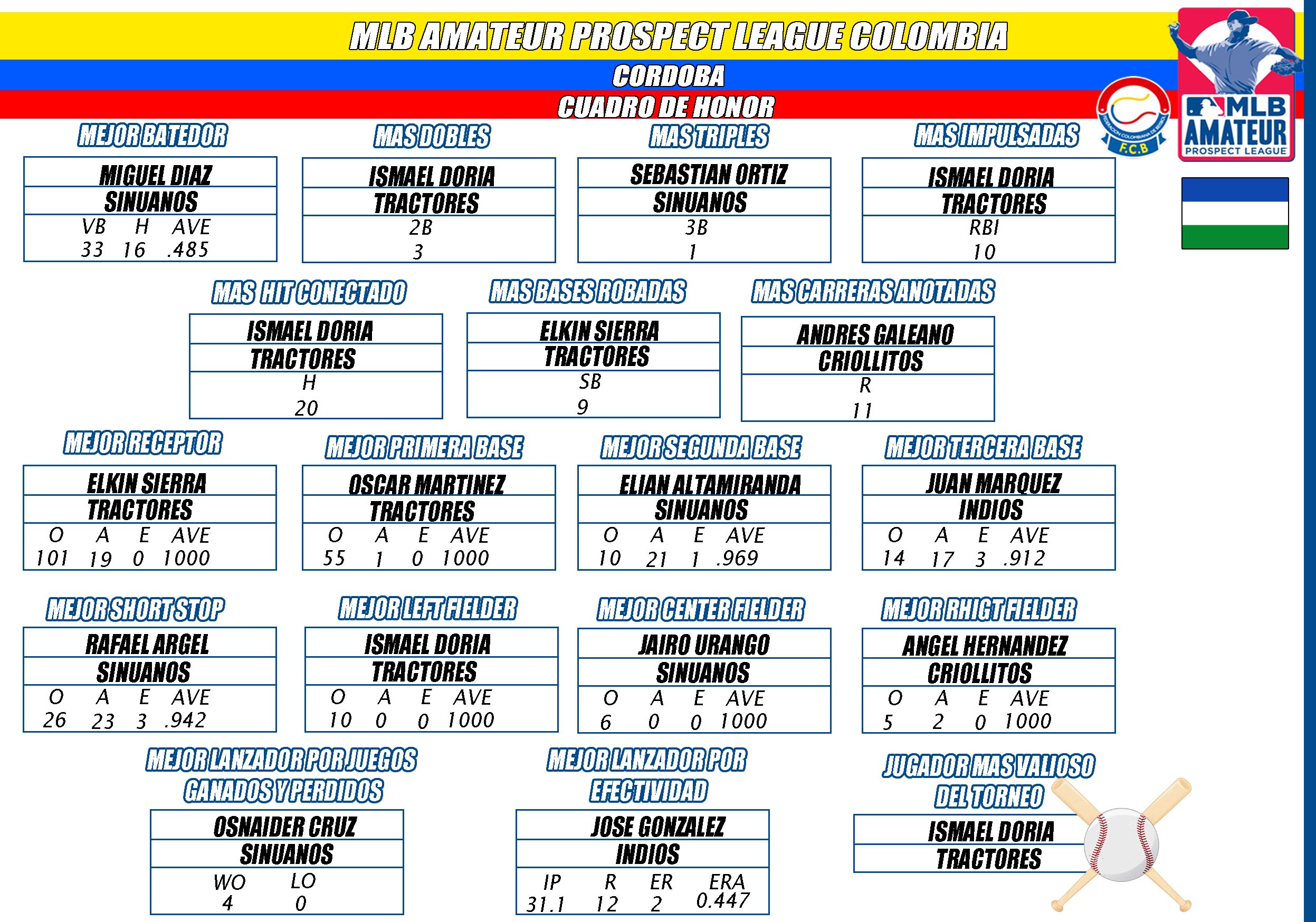 Jhon Rosales, de 4-4, un doble, un triple, 3 anotadas, 2 impulsadas. Ismael Doria, de 3-2, 2 anotadas, 3 impulsadas. Joseph Padilla, de 4-1, una anotada, dos fletadas, se destacaron en la ofensiva por los Tractores Ostreros de San Antero (Córdoba).