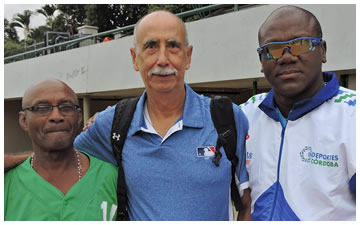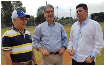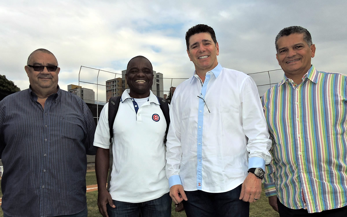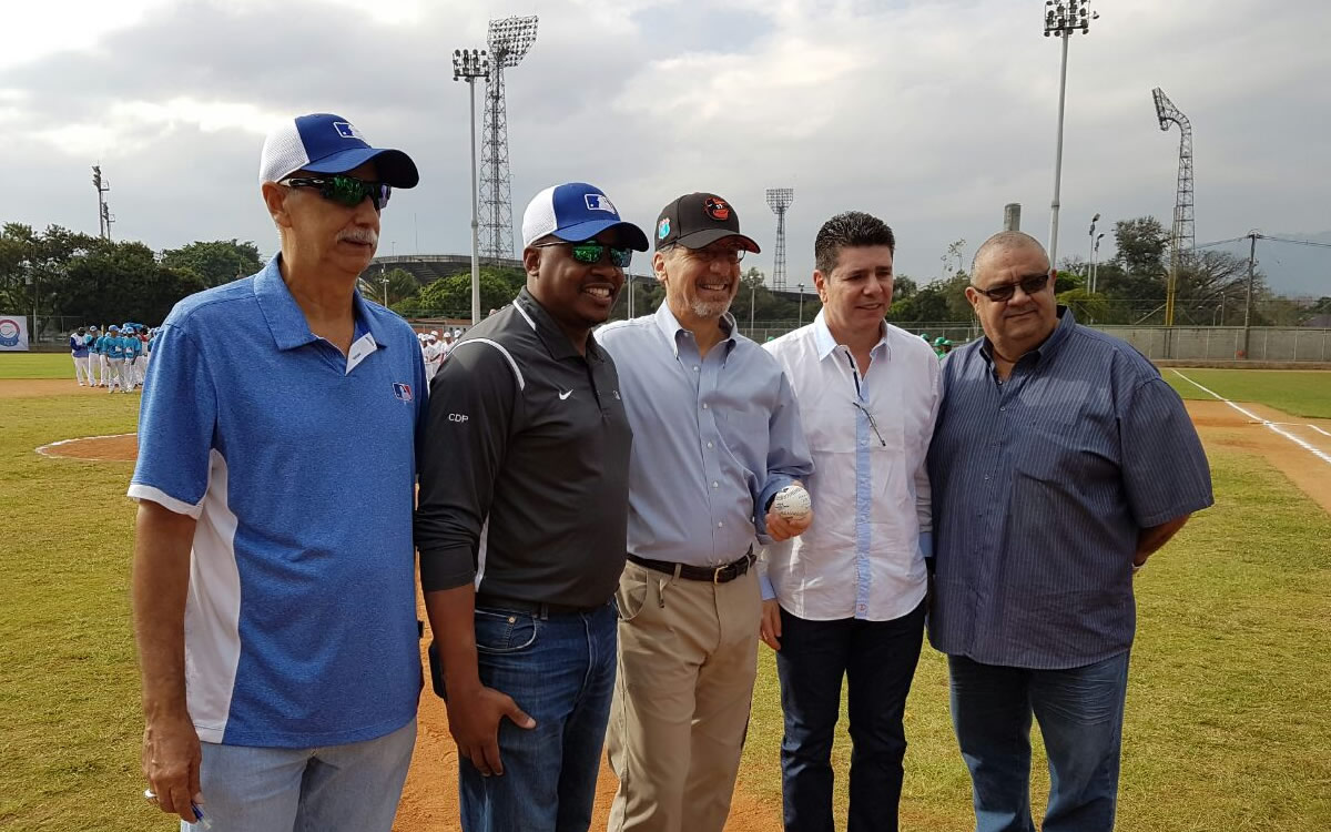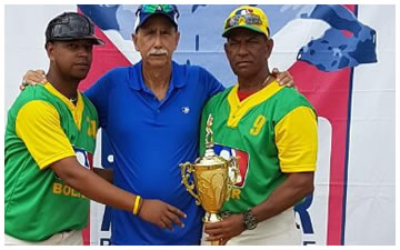 Raúl Ríos Jr y Raúl Ríos, manager de Bolívar, recibe el Trofeo de Campeón 2017 de manos de José Tito Quintero, coordinador MLB Colombia